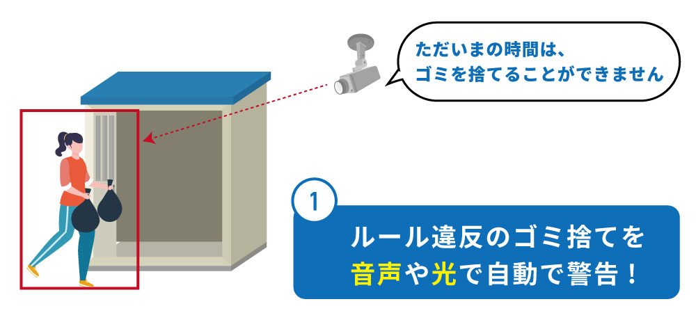 ルール以外の時間にゴミを捨てに来た人物を検知し、音声で警告できます。