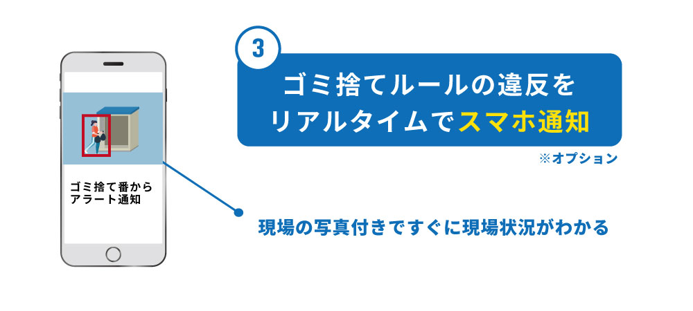 時間外にゴミ出しが行われた場合、AIが検知しスマホに通知を送れます。