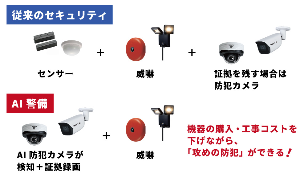 AIカメラによって、従来の防犯カメラと警備ではできなかった防犯対策が可能になりました。
