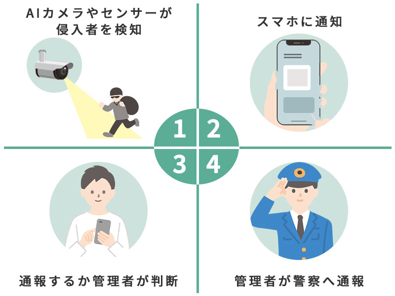 AI機械警備では、異常を検知したあと、映像をリアルタイムで確認し、必要に応じて利用者自身が警察へ通報します。